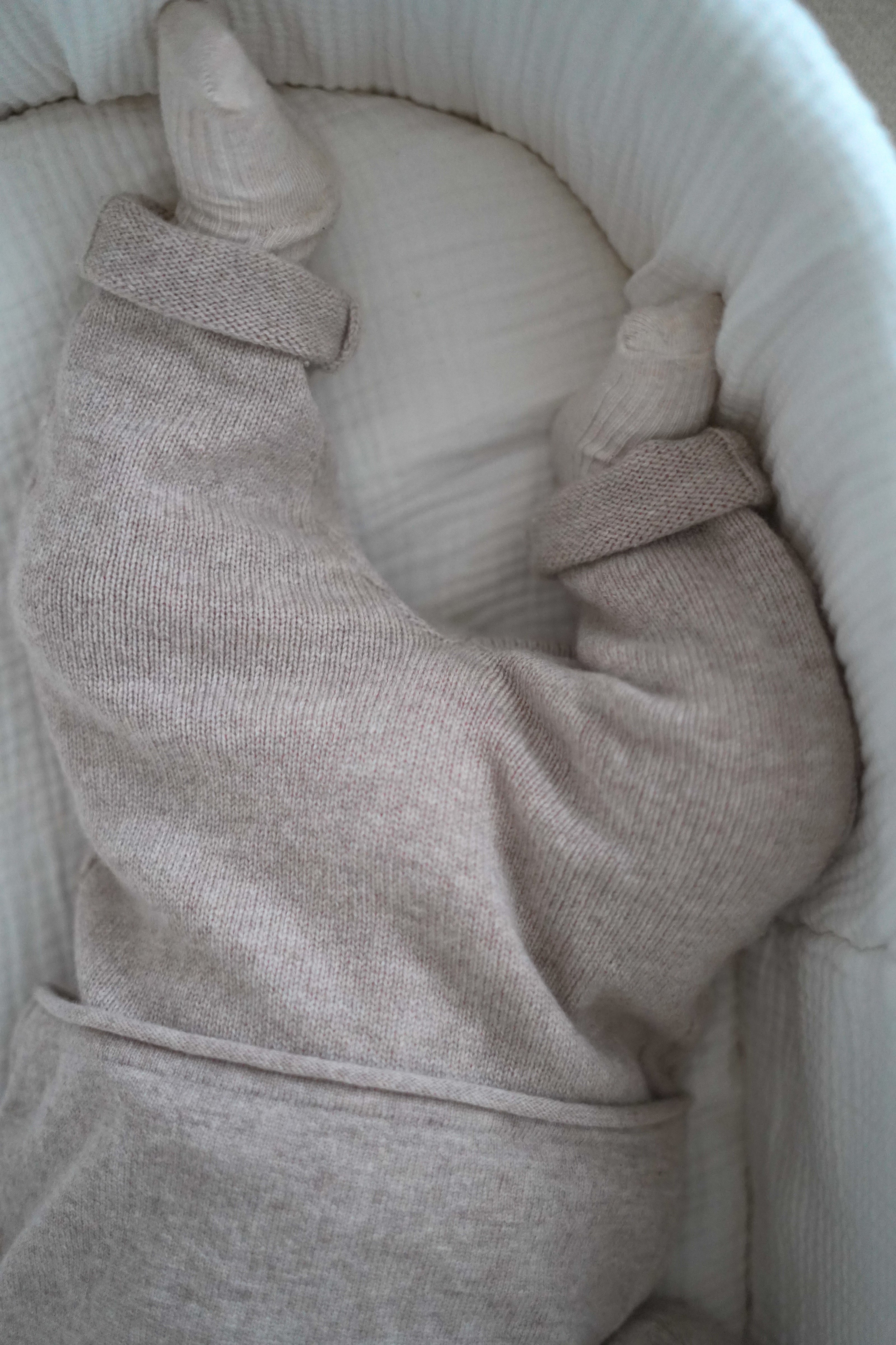 we believe that sustainability encompasses more than just material choices or production facilities; it also involves creating long-lasting pieces that are durable and grow with your child. Acknowledging how quickly babies grow, we want you to cherish our pieces for an extended period. Therefore, we have designed our sizing to accommodate from 0 to 6 months and from 6 to 12 months. Our collection features a slightly oversized fit, meaning you may need to fold the legs and sleeves during the first few months. This not only ensures a longer wear but also looks absolutely adorable, especially with our knitwear. See for yourselves.